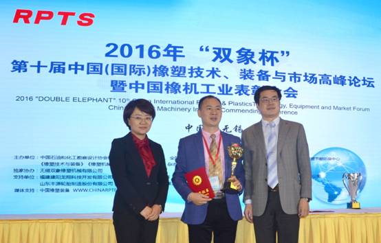 全国橡塑中心郑玉胜主任代表论坛主办方向第十届橡塑高峰论坛协办方无锡双象橡塑机械有限公司总经理吕伟先生颁发了纪念奖杯和证书。