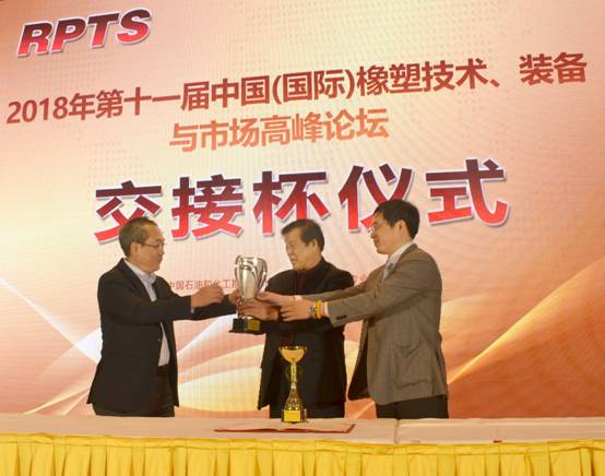 随后,大会主持人黄绍敏副秘书长宣布:第十一届高峰论坛的协办单位是中国化学工业桂林工程有限公司。大会全称为:2018年“桂林橡院杯”第十一届中国(国际)橡塑技术、装备与市场高峰论坛,并进行了大会交接杯仪式。